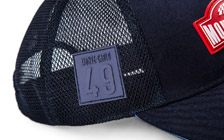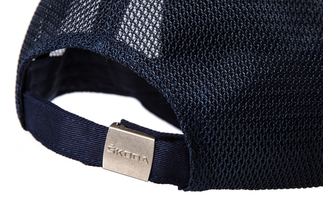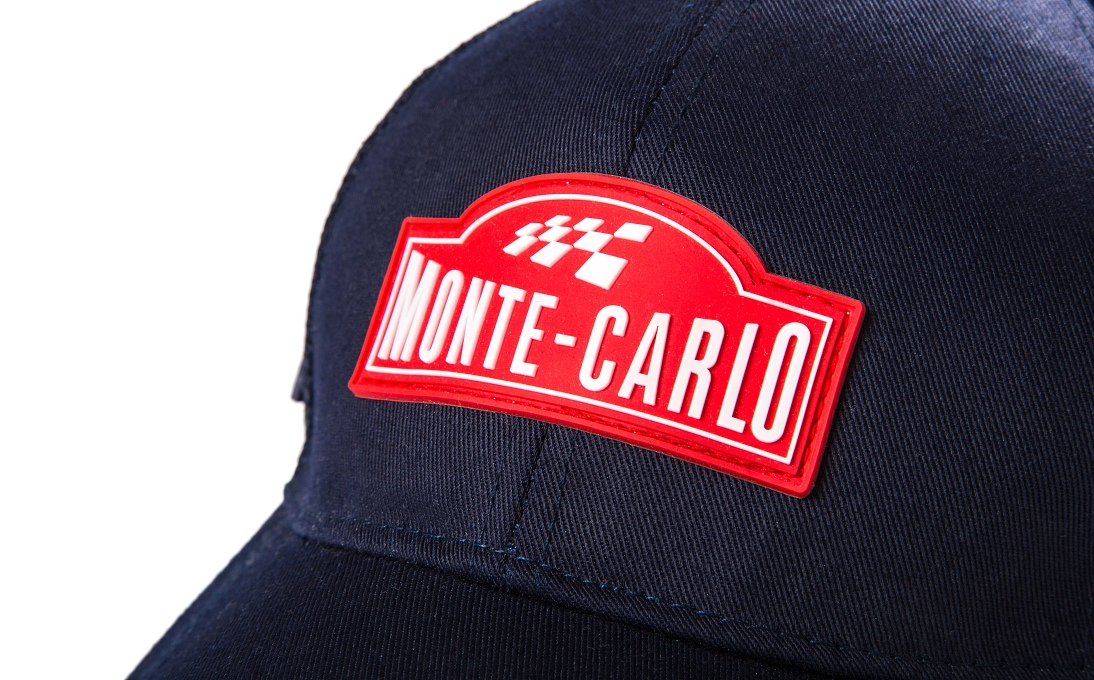 Dark blue unisex baseball cap with red logo Monte-Carlo. Cut with 6 panels, belt for regualtion of the size with a metal buckle with embossed logo ŠKODA. Sandwich piping in light blue colour. Patch with number 49 on the side.
