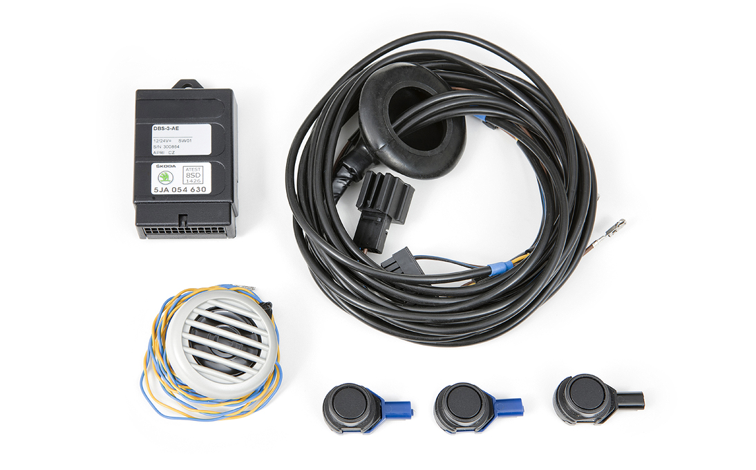 - Wiring harness, control unit (1), speaker (1), sensors (3), sensor shim rings (3), sensor brackets (3), paper template for sensor painting, terminal box (1), pricker, selfadhesive foam strip, zip ties, installation manual.