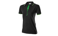 Women's polo shirt made out of elastic cotton with with Škoda Green color details on sleeves, collar and concealed button placket. The tonal Škoda logo is printed on the back, at the bottom right.